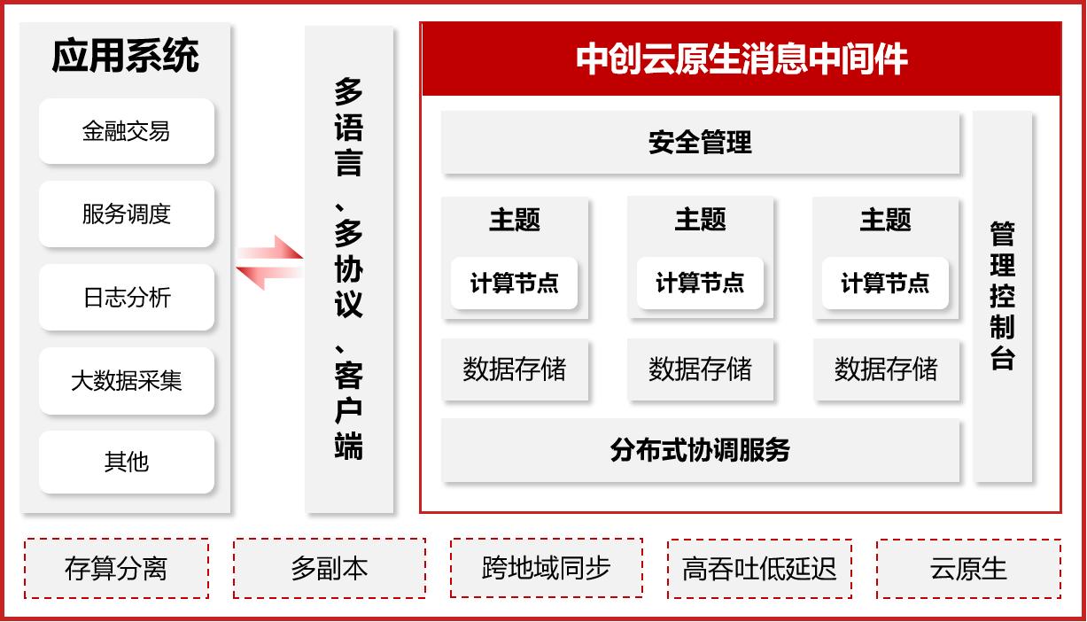 采用计算存储分离架构,计算节点(消息服务)与数据存储(持久化功能)均可独立进行伸缩,支持跨地域数据同步,支持多租户、命名空间机制。能够充分利用云计算资源优势,适应云平台环境部署、管理要求。