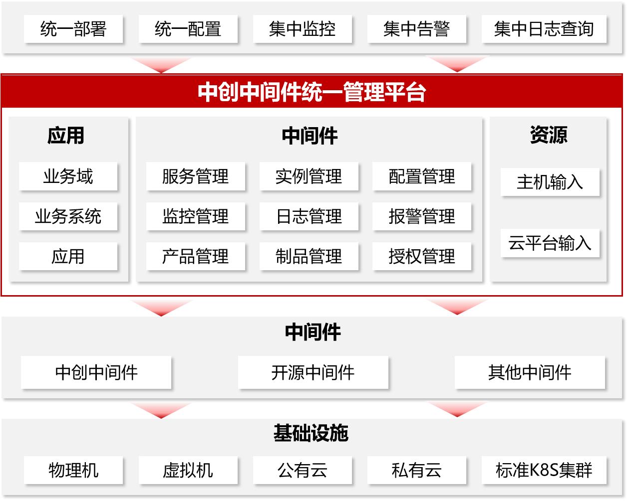 支持容器和非容器环境下的中间件统一管理,通过集成各种中间件产品和服务,提供统一的监控、配置和操作功能,为用户提供一致的管理体验。